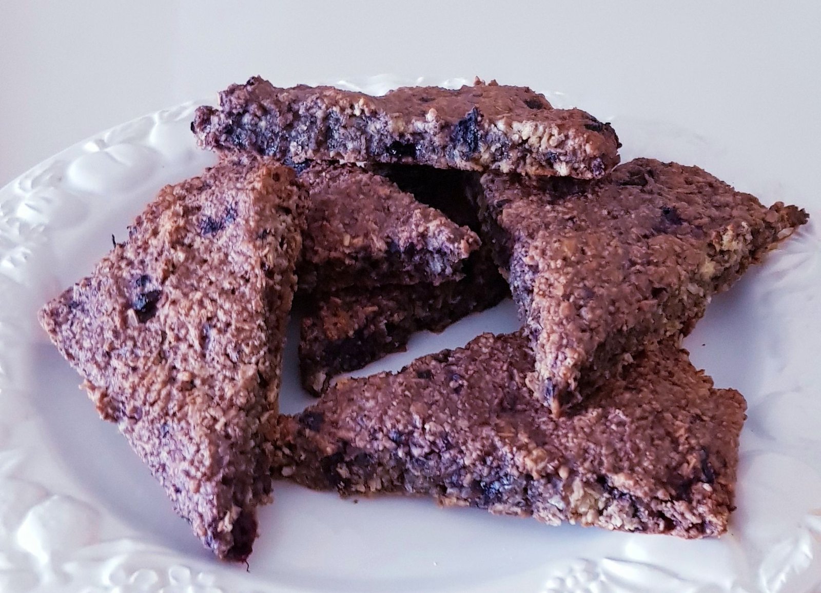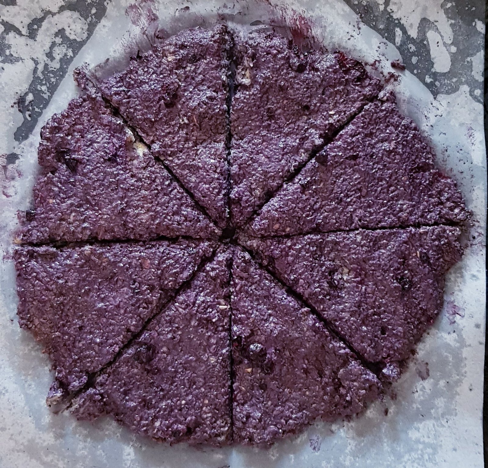 Sākumā pagatavojam linsēklu olu – kad tā gatava, lejam klāt augu pienu un dateļu sīrupu vai citu saldinātāju – ja lietojam medu, tad var arī to, un kā beidzamo pievienojam kokosriekstu eļļu, vēlams, lai tā ir jau šķidra, istabas temperatūrā. Tālāk atsevišķā traukā sajaucam visas sausās sastāvdaļas. Ja nav jau gatavi auzu pārslu milti, tad sasmalcinām food procesorā vai kafijas dzirnaviņās veselās auzu pārslas, līdz tās kļūst par miltiem. Tālāk sajaucam sausās sastāvdaļas ar mitrajām. Droši var jaukt ar rokām, masa būs bieza un viegli izklājama uz cepamā papīra. Iejaucam klāt meža mellenes un kārtojam uz cepamās pannas uz kuras uzklāts cepamais papīrs. Izveidojam apaļu formu un sagriežam 8 vienādos gabaliņos.