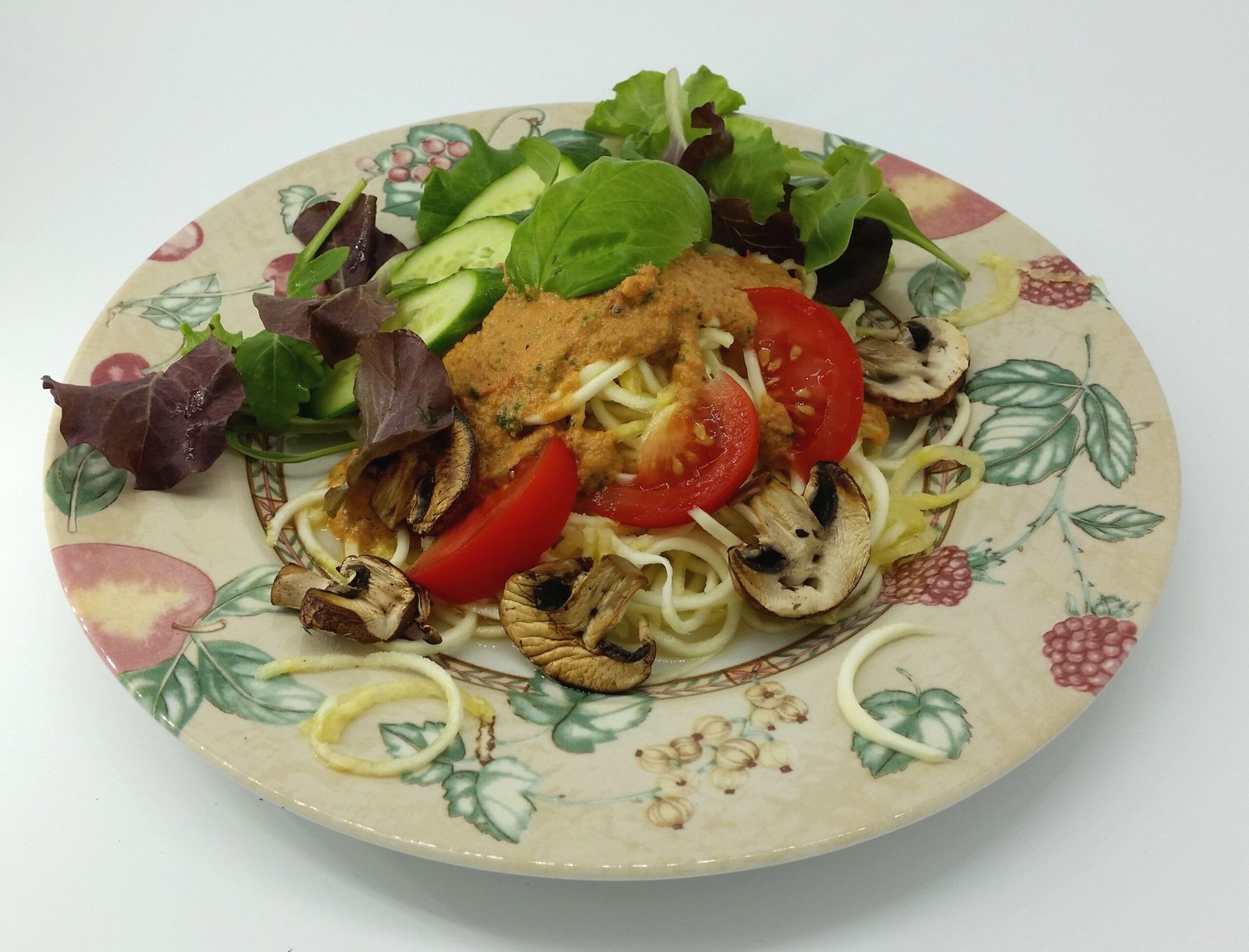 Servējam cukini šķīvjos, pārlejam ar pagatavoto bazilika pesto un saceptajām sēnēm. Dekorējam ar tomātiem un gurķu šķēlītēm un bazilika lapiņām. Lai labi garšo!