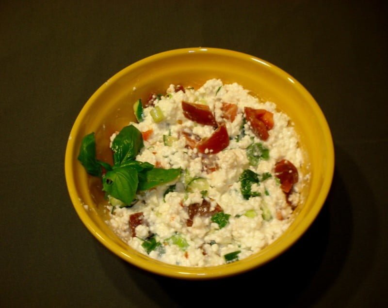 Gurķi un tomātu sagriež gabaliņos, var jaukt kopā ar biezpienu, var ēst arī atsevišķi. Grieķu jogurtu ieteicams sajaukt kopā ar biezpienu, lai tas nebūtu tik sauss.