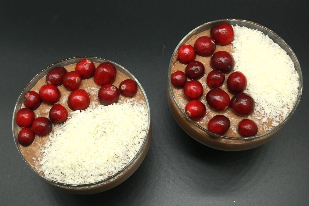 Uzvāram rīsus, tad rīsus vienā bļodā sajaucam kopā ar sojas pienu, datelēm, tofu un kakao – visu sablenderējam. Kad visa masa kļuvusi viendabīga, atstajam to uz brīdi atdzesēties. Pēc tam sadalām 4 daļās un saliekam trauciņos, pārkaisām ar kokosriekstu skaidiņām, bet var arī ar sēkliņām vai riekstiņiem, kas mājās pieejami.